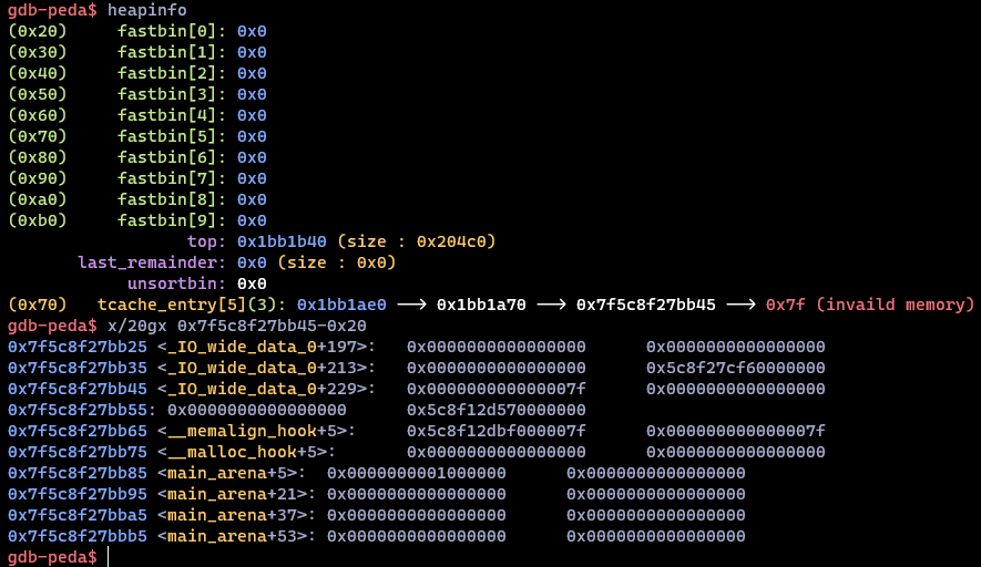 - tcache 的 bk 欄位原本沒用,在這邊會放 tcache 位址當作 key,用來做 double free detect