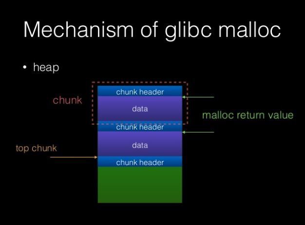 chunk被free的話被則會加入名為bin的 link-list chunk的種類分為Allocated chunk、Free chunk、Top chunkmalloc所需要的空間有可能不等於chunk實際得到的空間