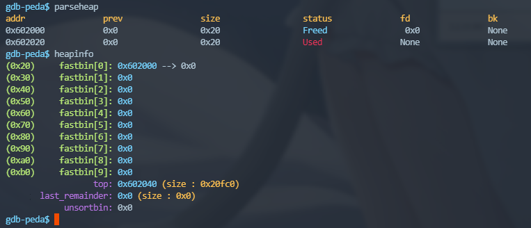 - 因為有 tcache 的機制,所以我們只要把 tcache 填滿七個,第八個就會跑到 fastbin 裡面,在那裏面就可以繼續用 2.25 之前的 double free 手法