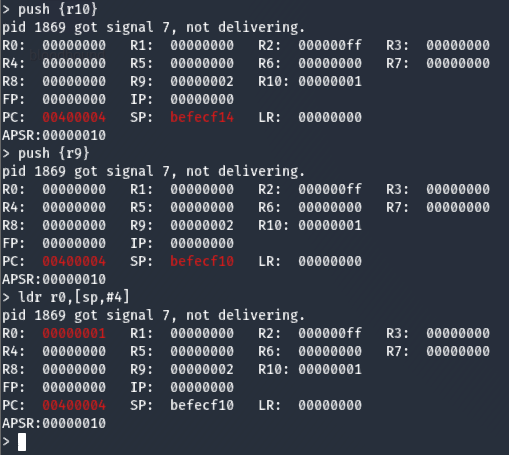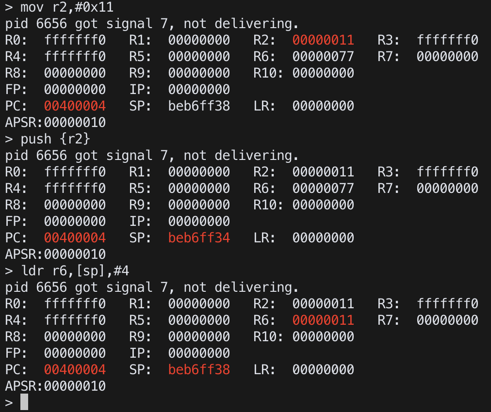 ldr r6,[sp],#4 = mov r6, [sp+0x4] ; add sp, 4 = pop r6