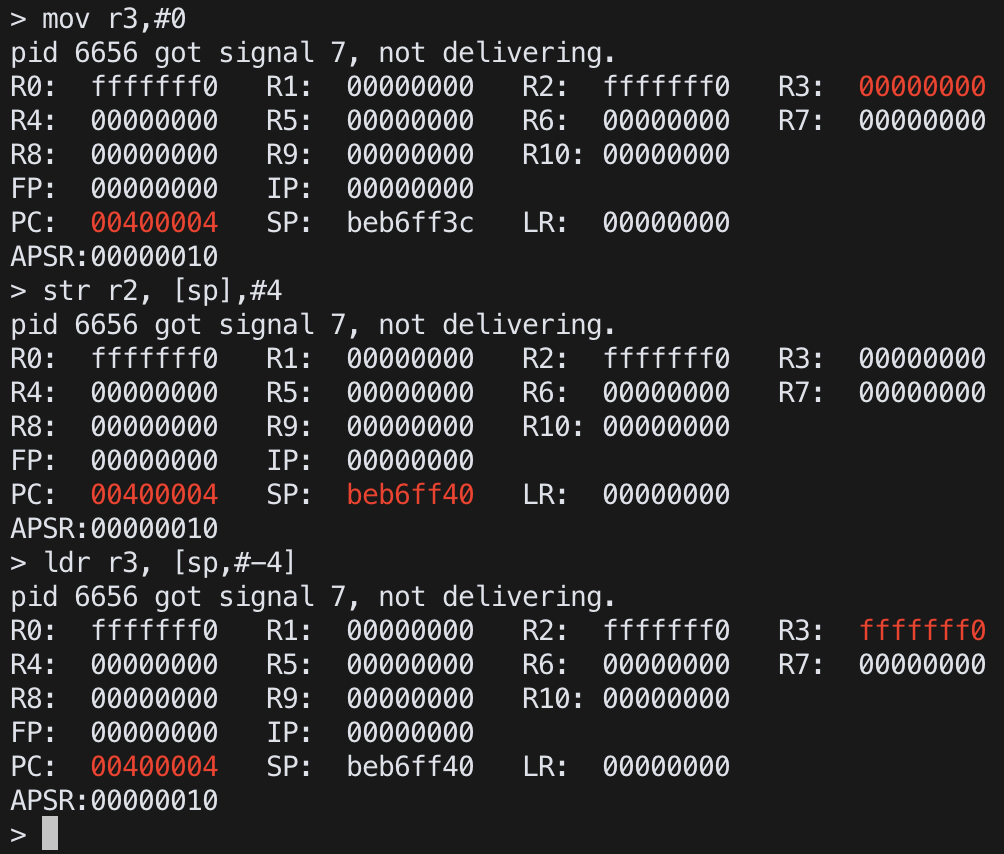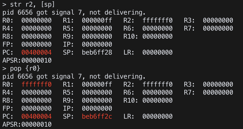str r2, [sp],#4 = mov [sp], r2 ; add sp, 4